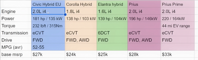 Honda Civic Hybrid EU and Prius, Prius Prime Comparison