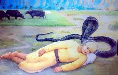 After a few days, Rai Bular saw another Kautak. He was returning back to a nearby village on a horse. He saw that Sri Guru Nanak Sahib ji was fast asleep in the shade of a tree. Cows and buffaloes are sitting encircled around him. When he came closer, he saw that a funnier snake was sitting in the shade of Guru Sahib. Hearing the clatter of the horse’s hooves, the snake ran away. Guru Sahib Ji sat up and looked towards Rai Bular with a loving smile.